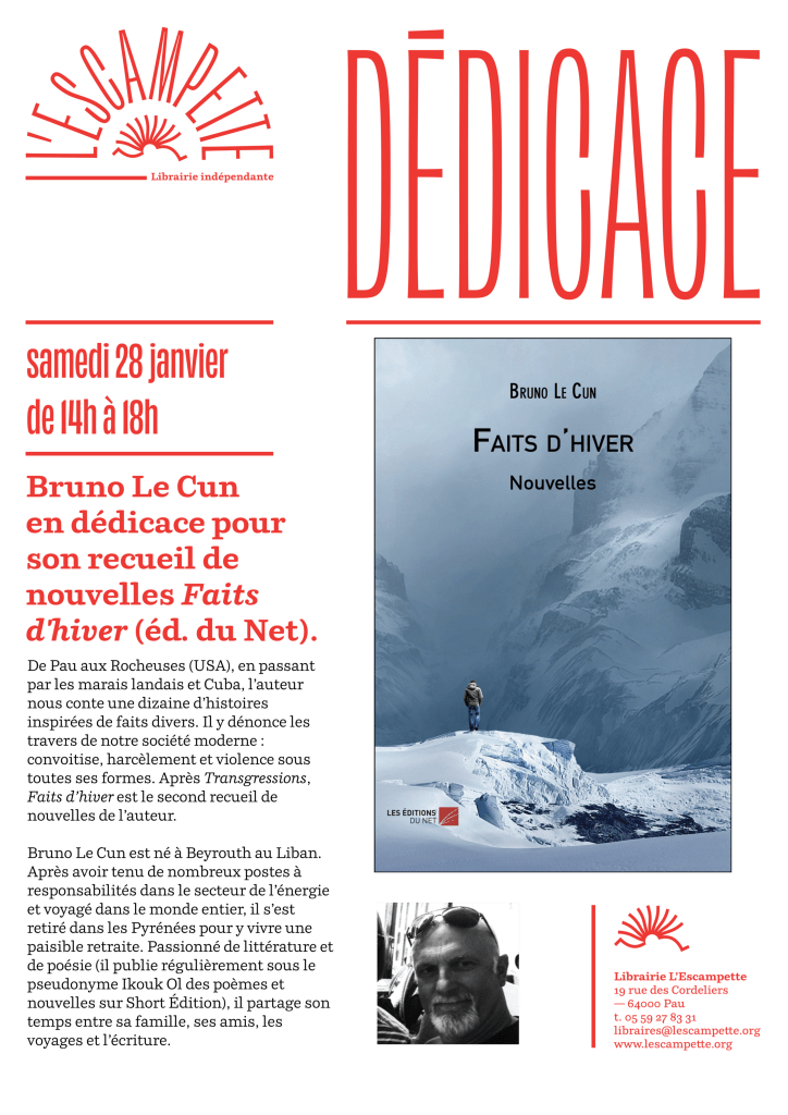 Samedi 18 janvier de 14h à 18h , en dédicace à la librairie l’Escampette , pour mon recueil de nouvelle Faits d’hiver.