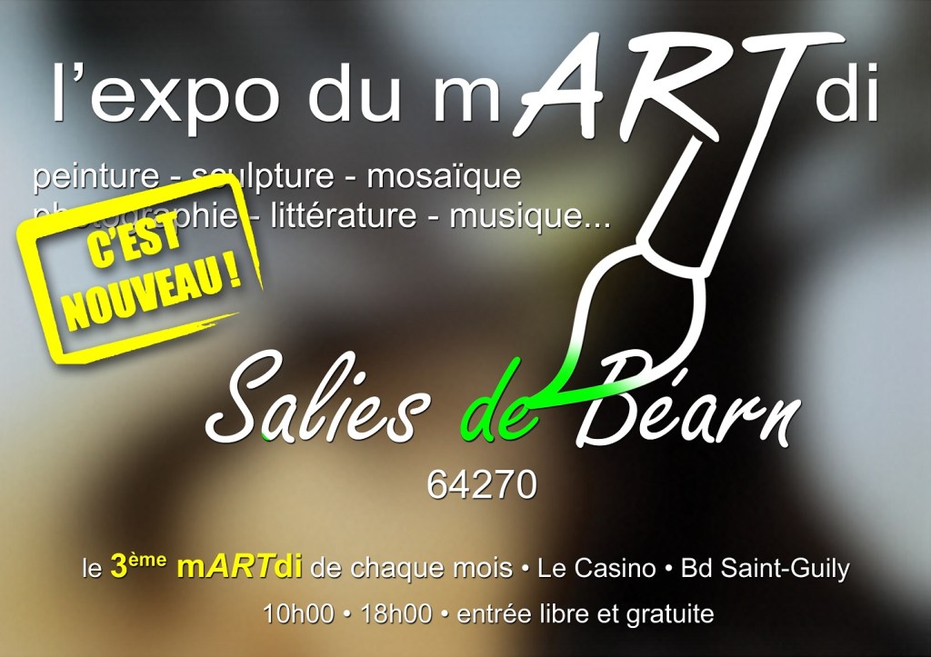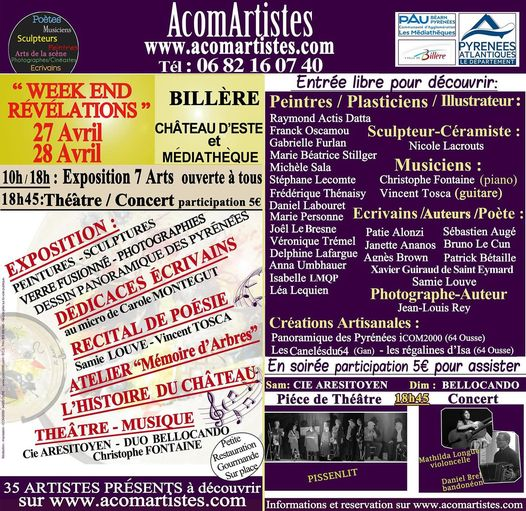 Samedi 27 et Dimanche 28 : « Week-end révélations »; 14ème exposition de l’association AcomArtistes, au cours de laquelle de nombreux artistes, écrivains, musiciens, peintres, poètes et sculpteurs viendront présenter et dédicacer leurs oeuvres à la Médiathèque de Billere (64140) et Chateau d’Este.