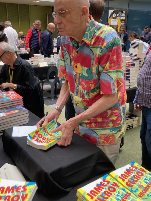 Sa présence à Pau, dans le cadre du salon « Un aller-retour dans le noir », a été un événement marquant. Ce salon, devenu un incontournable pour les passionnés de polars, nous a offert la chance de découvrir « The enchanters »1 le dernier polar de Ellroy en dédicace.